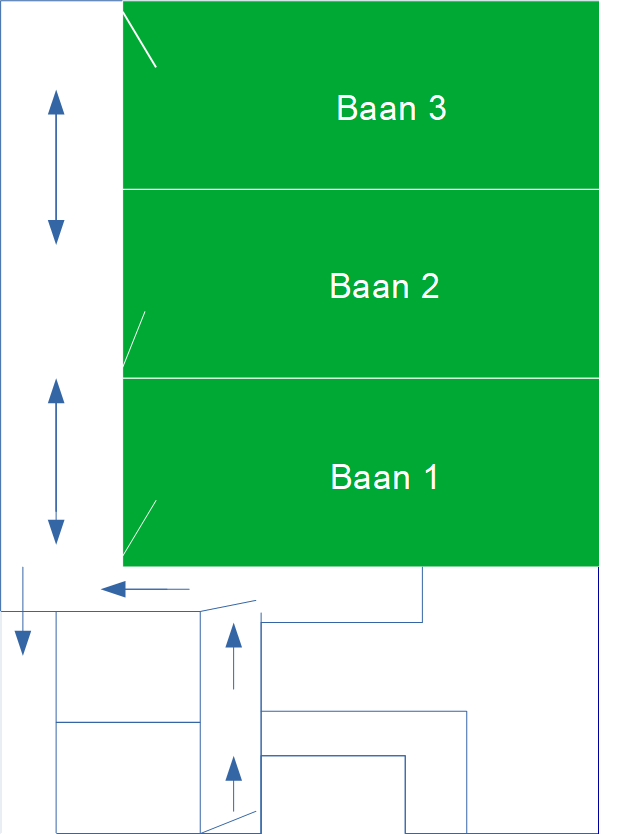 Gebruik de achteringang → ga door de gang die langs de kleedkamers loopt naar de tennishal → ga vervolgens linksaf → desinfecteer je handen → ga dan door de lange gang naar de deur van de baan waarop je speelt.