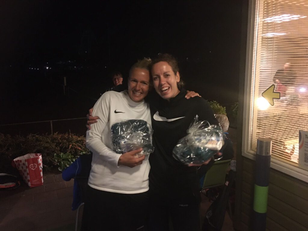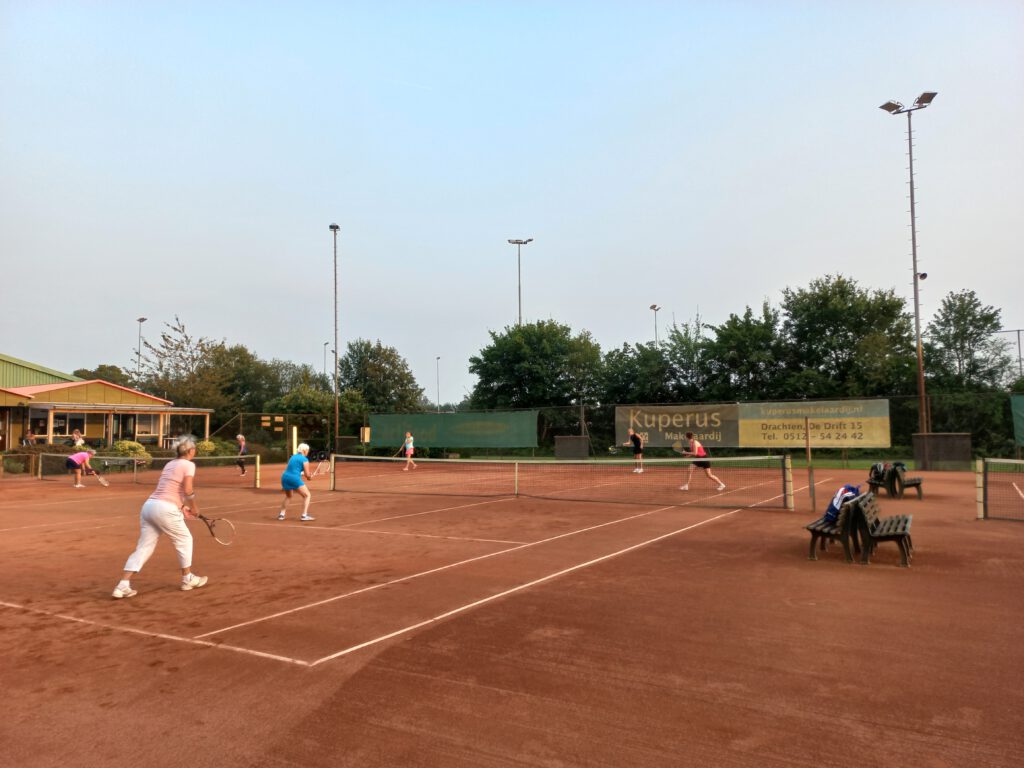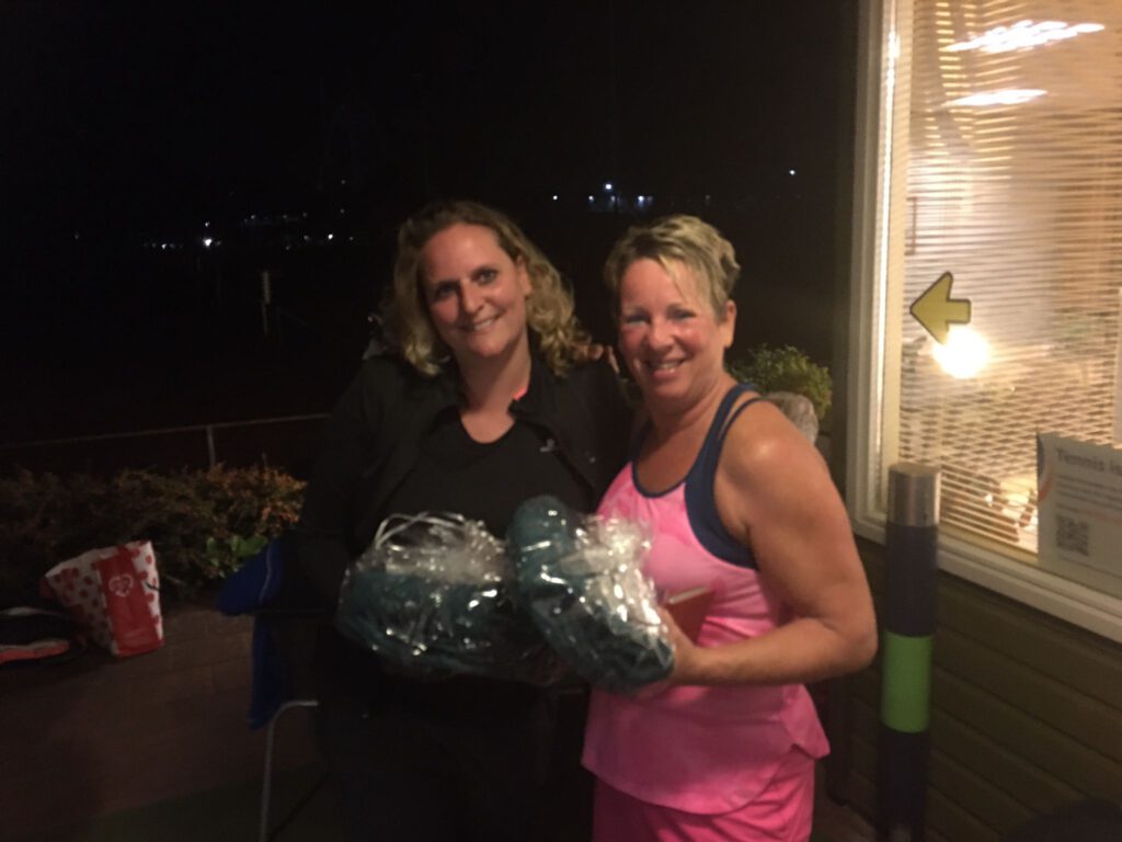 En dan de dames dubbel 1. Hier waren 4 koppels die om de eer gingen strijden. Nou dat hebben ze geweten. De wedstrijd van Geke/Marga tegen Hanny/Tineke was heel spannend en duurde 2 uren. Na 3 sets wonnen Hanny/Tineke. De avond erna moesten Hanny/Tineke tegen Jannie/Anja . Dit werd een bloedstollende strijd. In de eerste set stonden Jannie/Anja met 4 – 1 achter. Deze wisten ze toch nog te winnen. De 2e set herpakten Tineke/Hanny zich en wonnen met 6 – 2. Toen de 3e set, waar Jannie/Anja weer tegen een achterstand van 5-1 aan keken. Maar het is pas voorbij tot de laatste bal is geslagen dus langzaam kropen ze dichterbij. Het werd uiteindelijk een tie-break die door Janny en Anja werd gewonnen. Ze hadden 2 1/2 uur op de baan gestaan. Jestine en Dea hadden tegen deze 3 koppels ook mooie potjes, maar met iets minder strijd kunnen zij zich dit jaar clubkampioen noemen.