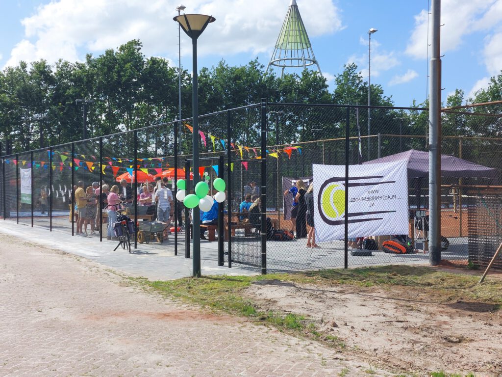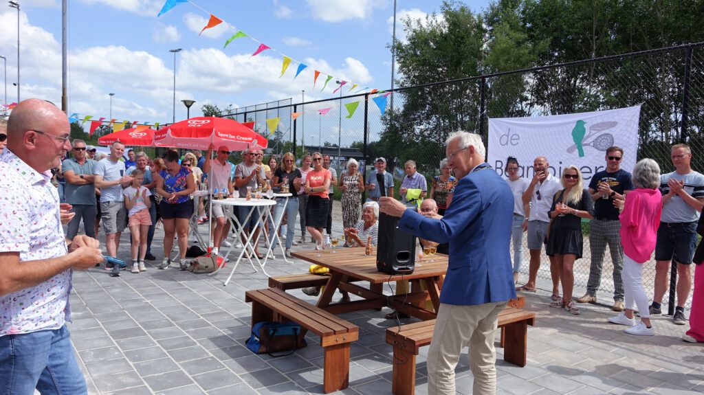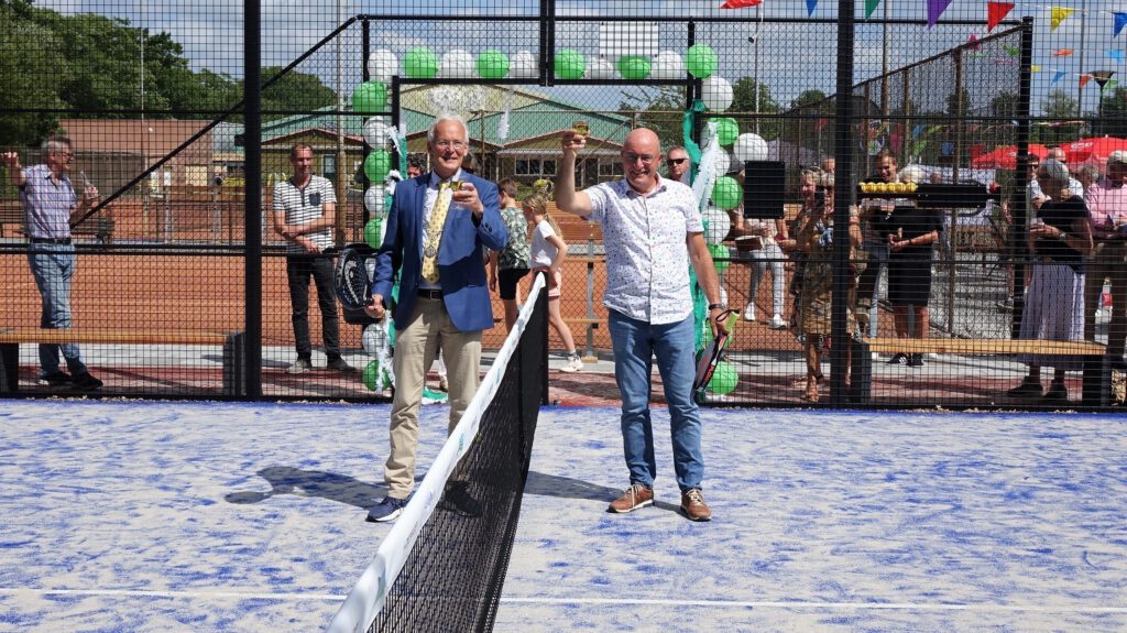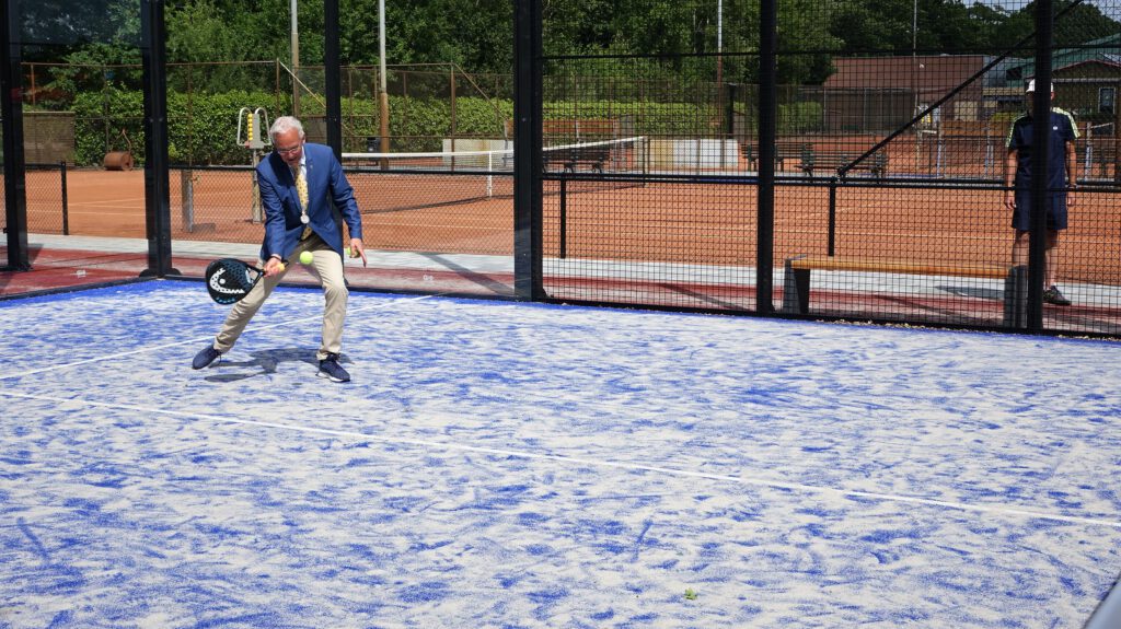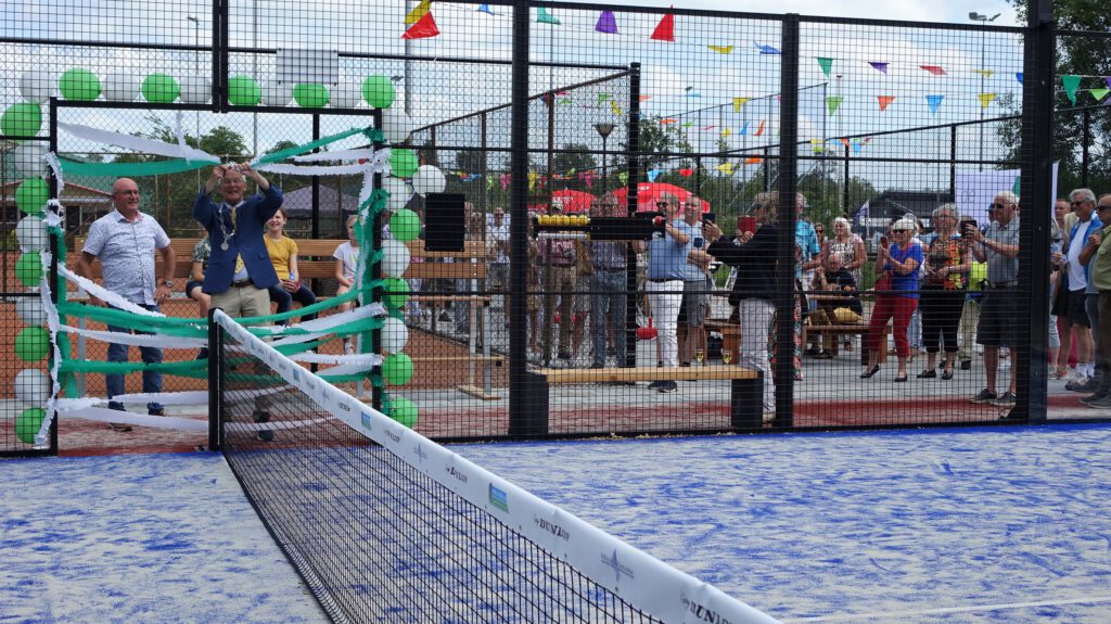 Vervolgens hield burgemeester Rijpstra een praatje met als belangrijkste item de Mienskip. Dit sloot mooi aan bij Jos zijn verhaal over onze vrijwilligers. Daarna had de burgemeester de eer om de baan te openen en vervolgens een “padelballetje” met Jos te slaan. Sportief als hij is, ging hem dat goed af.
