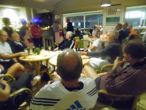 Op het terras werden alle 34 deelnemers verwelkomd door de organisatie, die in een tentje druk bezig was om oliebollen en appelflappen voor ie